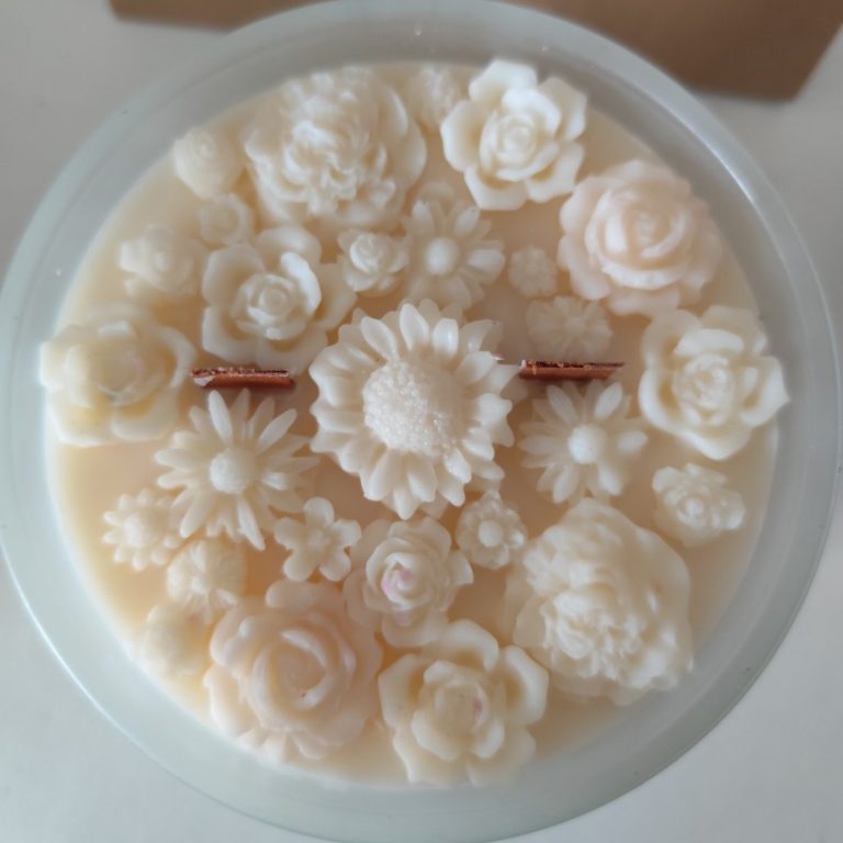 Un contenant particulièrement précieux car c'est une bougie allumée tous les jours à la mémoire du père de ma cliente. J'ai voulu lui apporter un peu de douceur avec un dessus de fleurs blanches.